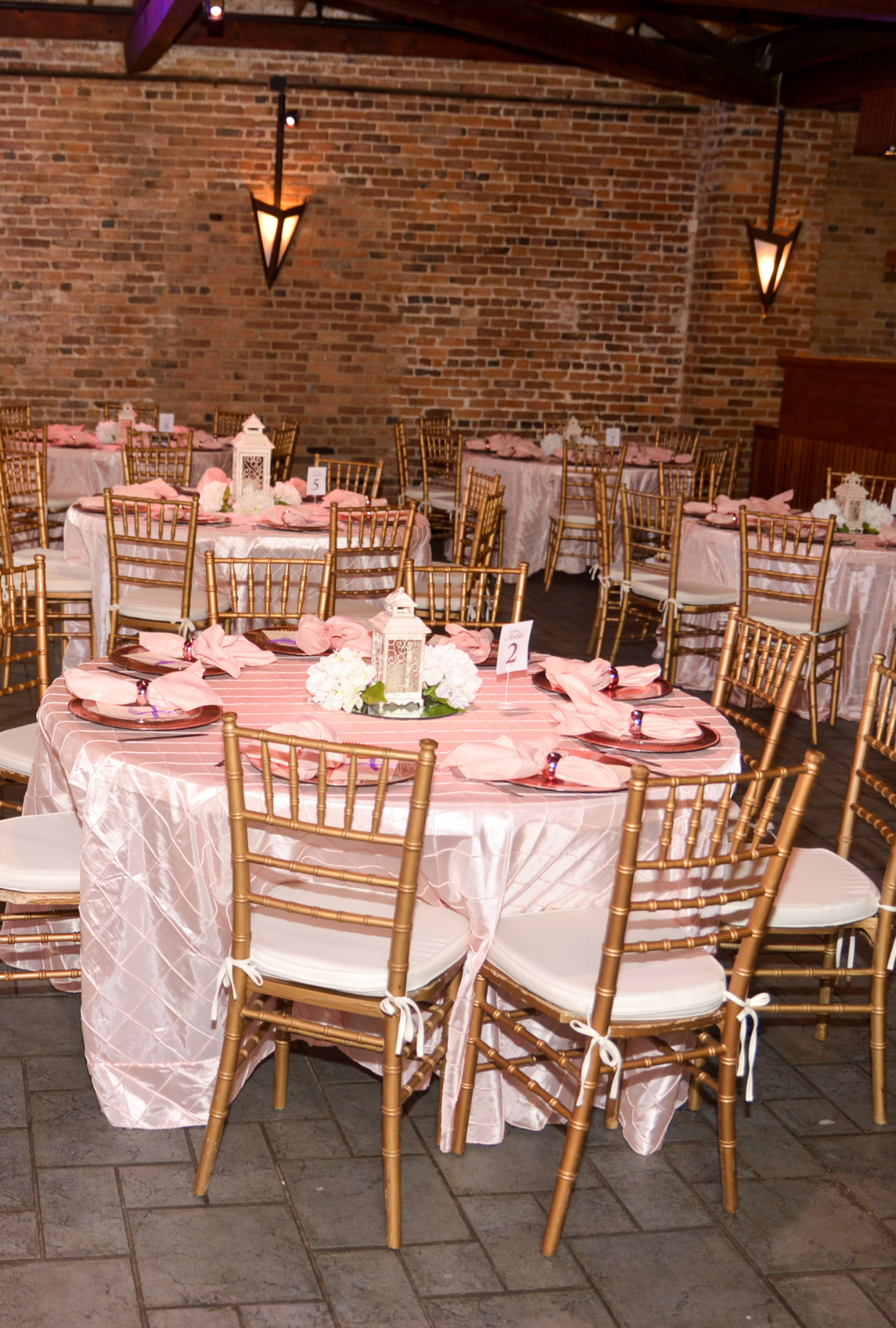 We provide/coordinate linens for tables and chairs. In addition, we provide an array of centerpieces and accessories.